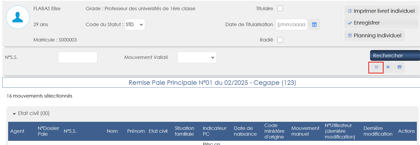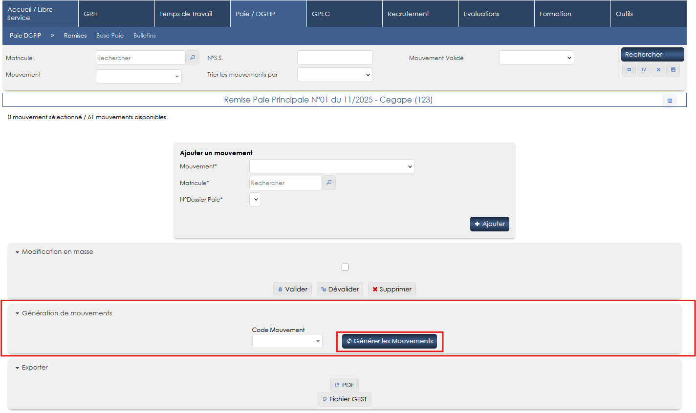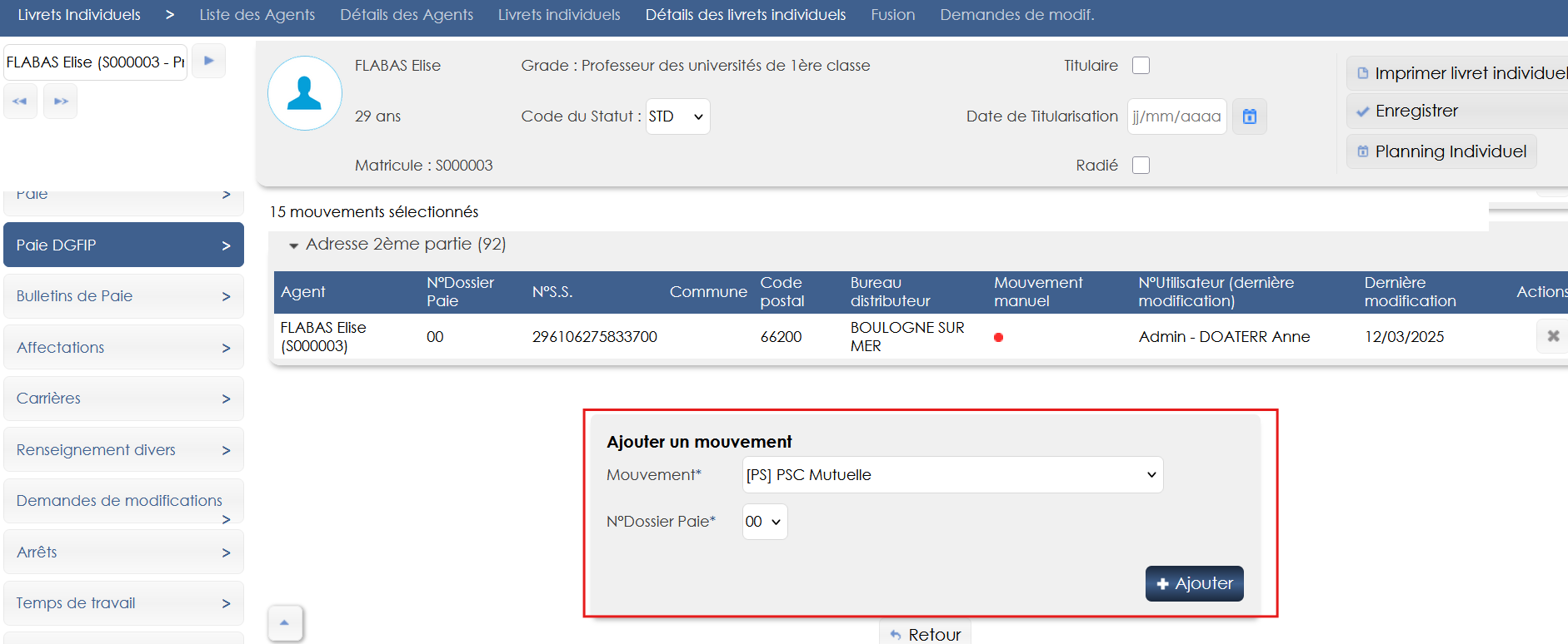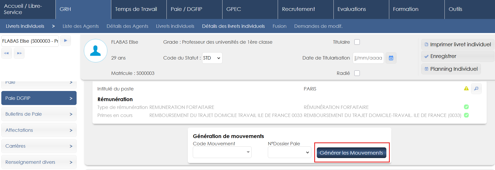 La génération individuelle des movement se fait depuis le livret individuel de l’agent, dans l’onglet “Paie DGFiP”.