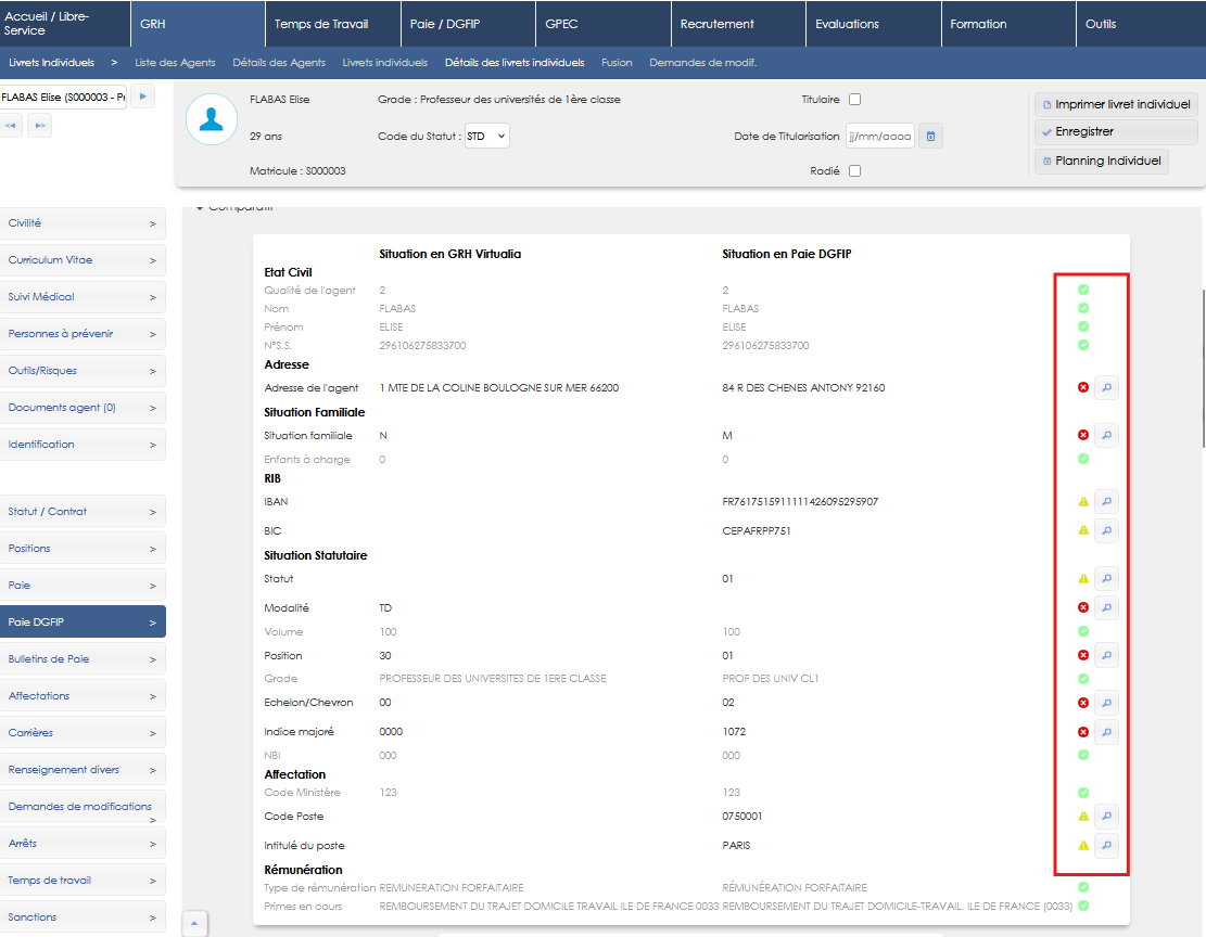 GRH > Livrets individuels > détails des livrets > Paie DGFiP