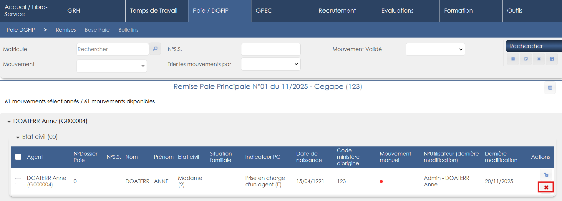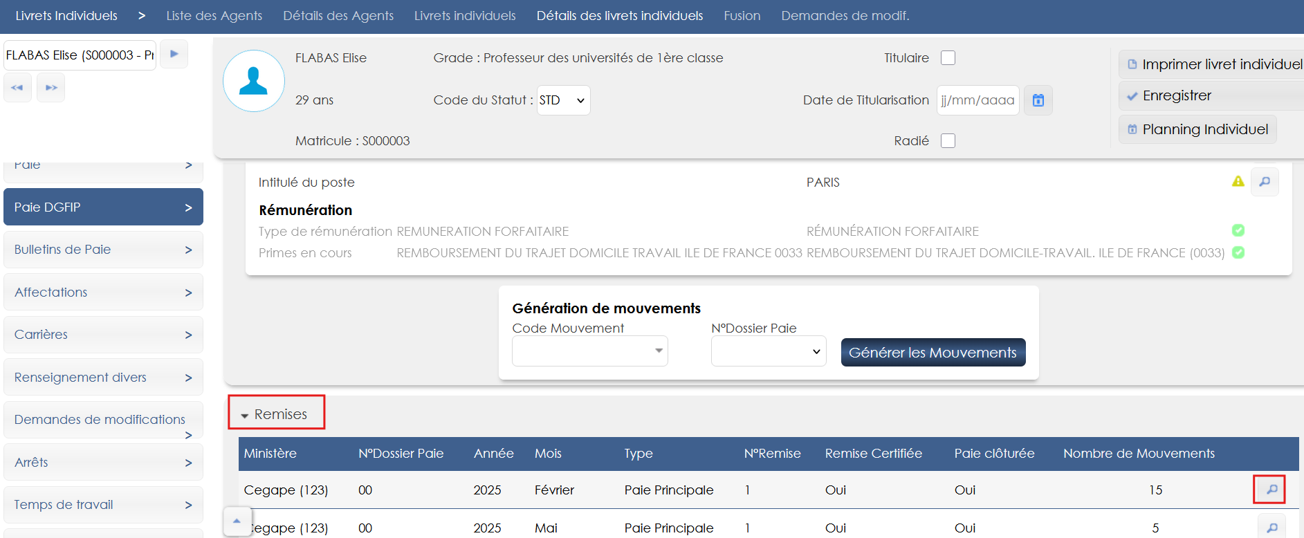 - Dans GRH > Livrets individuels > détails des livrets > Paie DGFiP > Remises, aller dans le détail de la remise