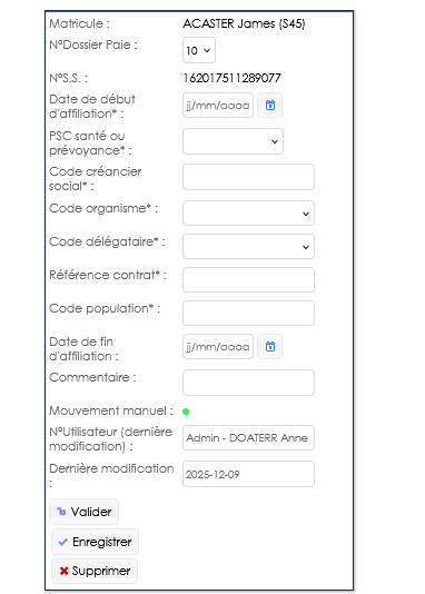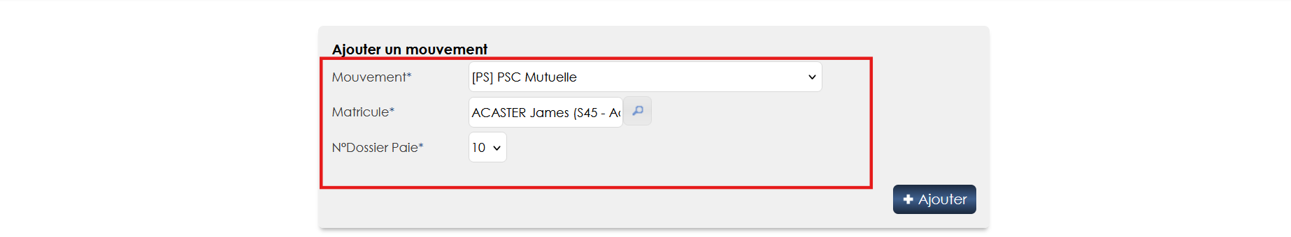 Aller dans le bloc “Ajouter un mouvement” en bas de m’écran et sélectionner le mouvement à ajouter et le dossier de paie visé