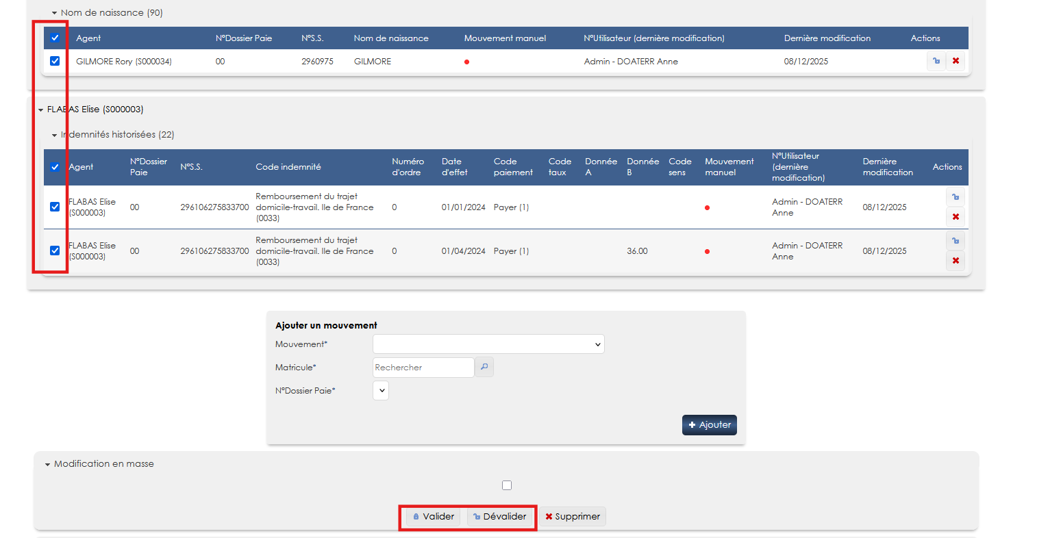 Cocher la case dans le bloc “Modification en masse” ou ne rien cocher puis cliquer sur “Valider” ou “Dévalider” dans “Modification en masse” Valide ou dévalide tous les mouvements affichés à l’écran.