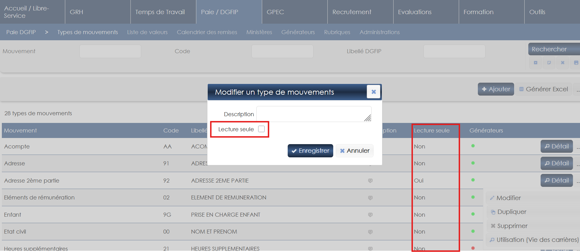 Pour que cela soit possible, les types de mouvements ne doivent pas être en lecture seule. Dans “Paie/DGFIP/Administration > Paie DGFIP > Type de mouvements”, décocher la case “Lecture seule” pour les mouvements qui doivent pouvoir être créés manuellement.