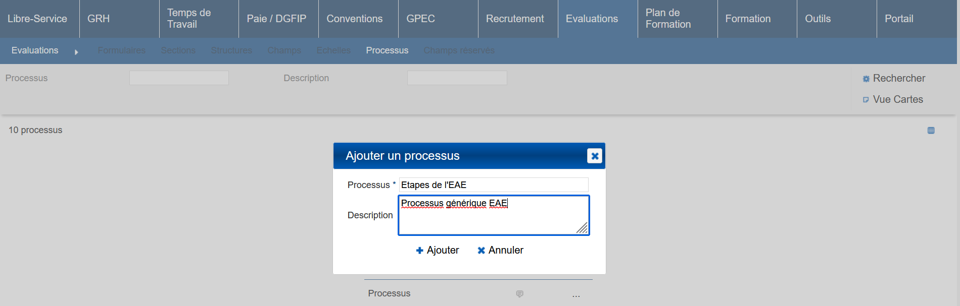 Le processus permet de définir les étapes de la campagne d’évaluation : qui doit répondre à quel étape, et les caractéristiques de chaque étapes. Les Processus sont les seuls référentiels qui peuvent être paramétrés independamment des autres. Il doivent seulement être saisis avant les Formulaires (les Formulaires devant intégrer un processus).