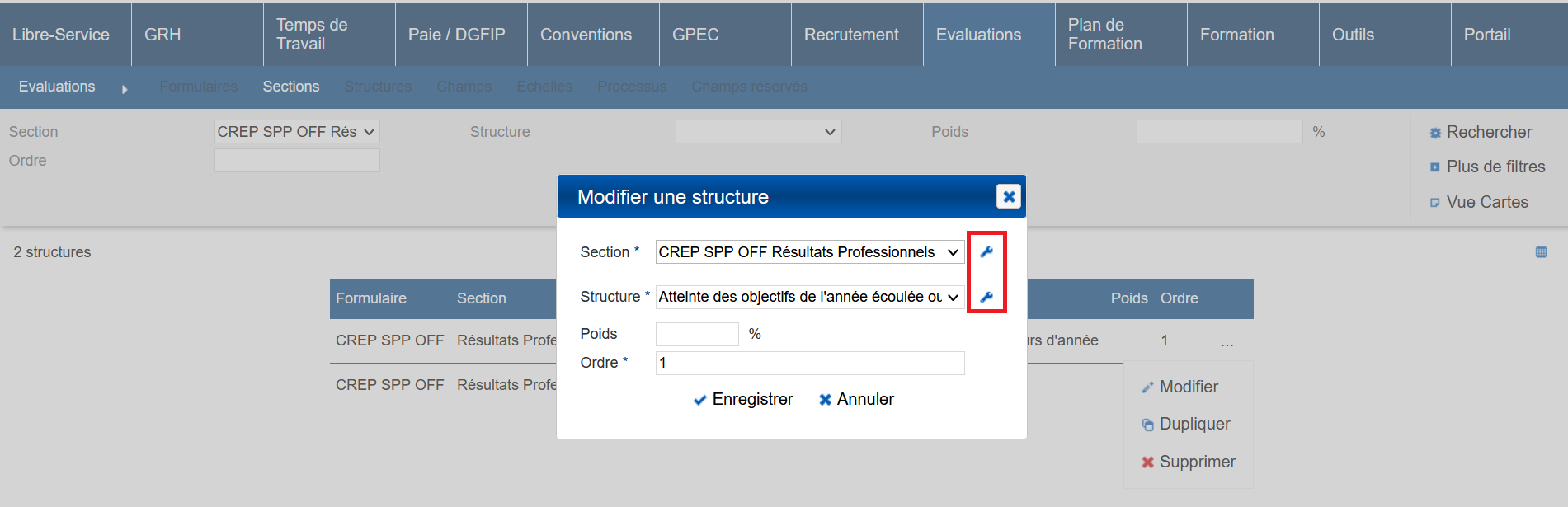 Avant de pouvoir créer une campagne d’évaluation, les formulaires doivent être paramétrés. Pour ne pas être bloqué dans les étapes ils devront être paramétrés dans un certain ordre. Si le paramétrage n’a pas été effectué au préalable, les écrans restent accessibles via l’icône de clé à molette disponible dans certains écrans.