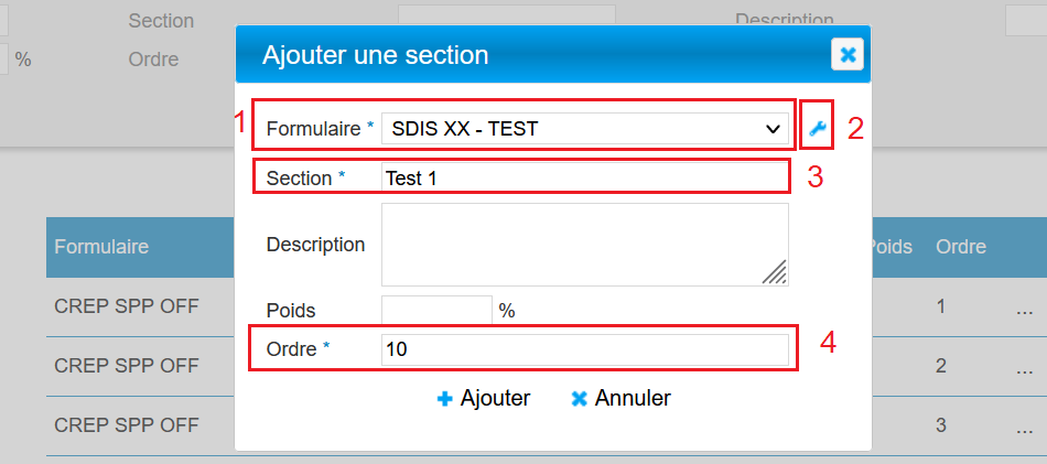 Les formulaires contiennent des sections qui contiennent elles-même des structures. Avant de pouvoir paramétrer les sections, il faut d’abord créer les formulaires.