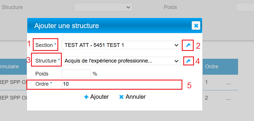 - Section : sélectionner la section à laquelle ajouter la structure (1) ou cliquer sur l’icône clé pour retourner à l’écran de création des sections (2)