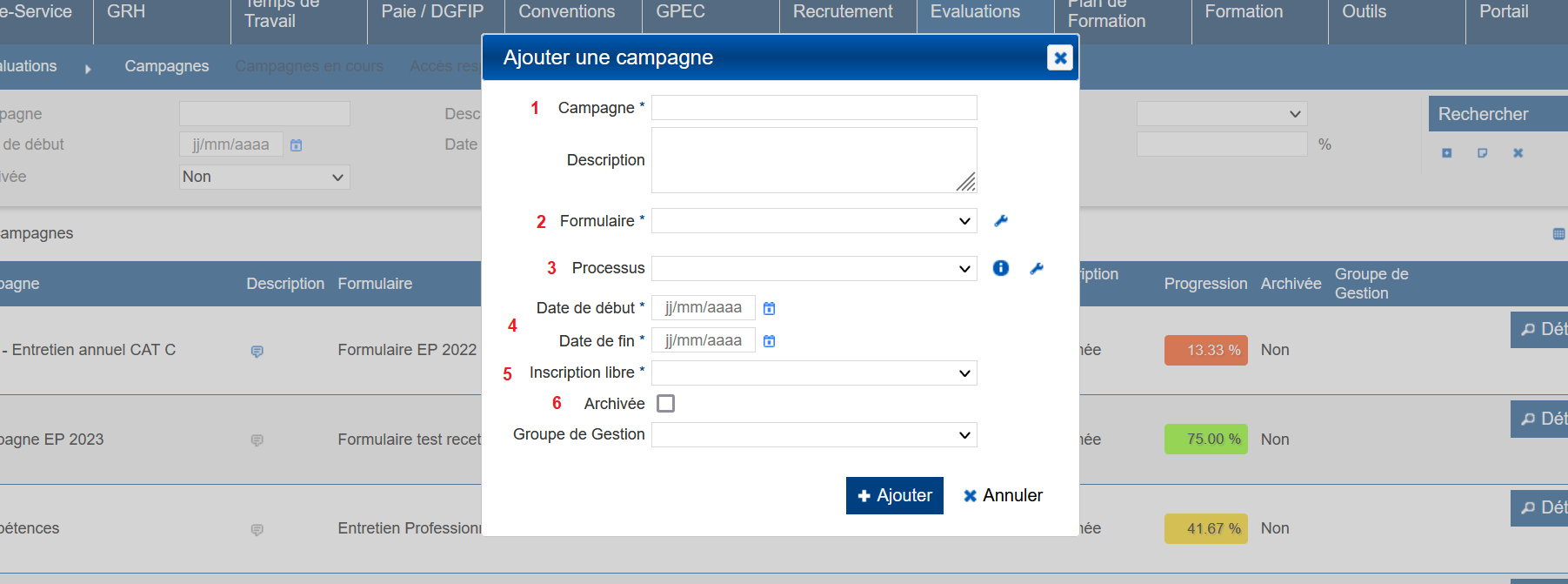 - Campagne : renseigner le nom de la campagne d’évaluation (1)