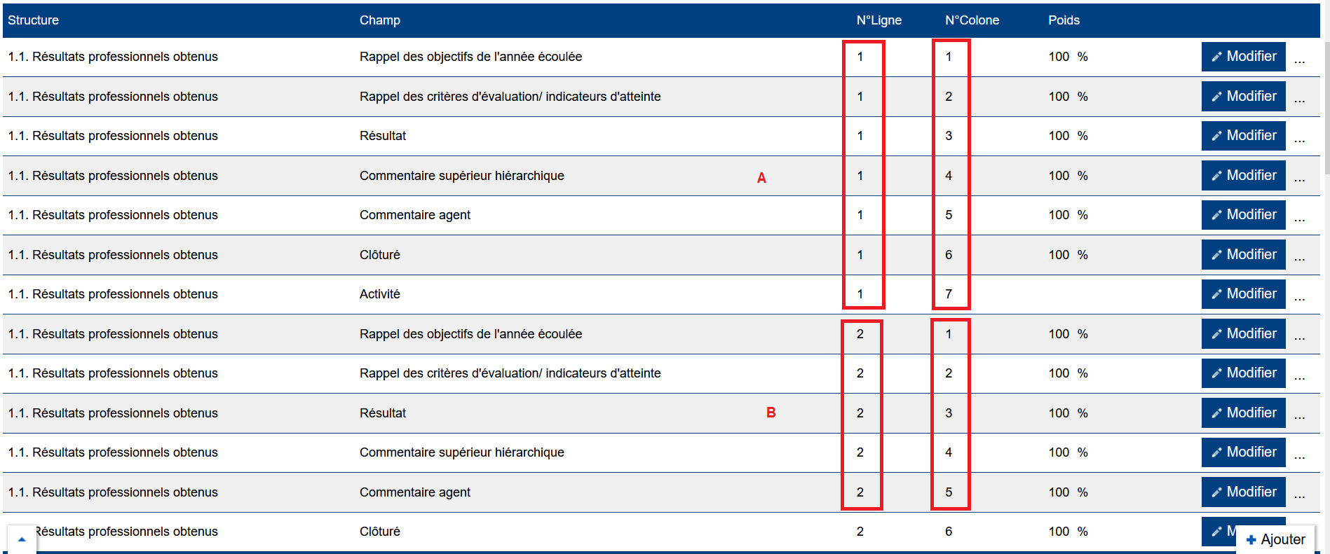 Le positionnement automatique des champs dans la structure implique qu’un champ seul sur une ligne prendra 3 colonnes si une autre ligne du même tableau contient 3 colonnes.