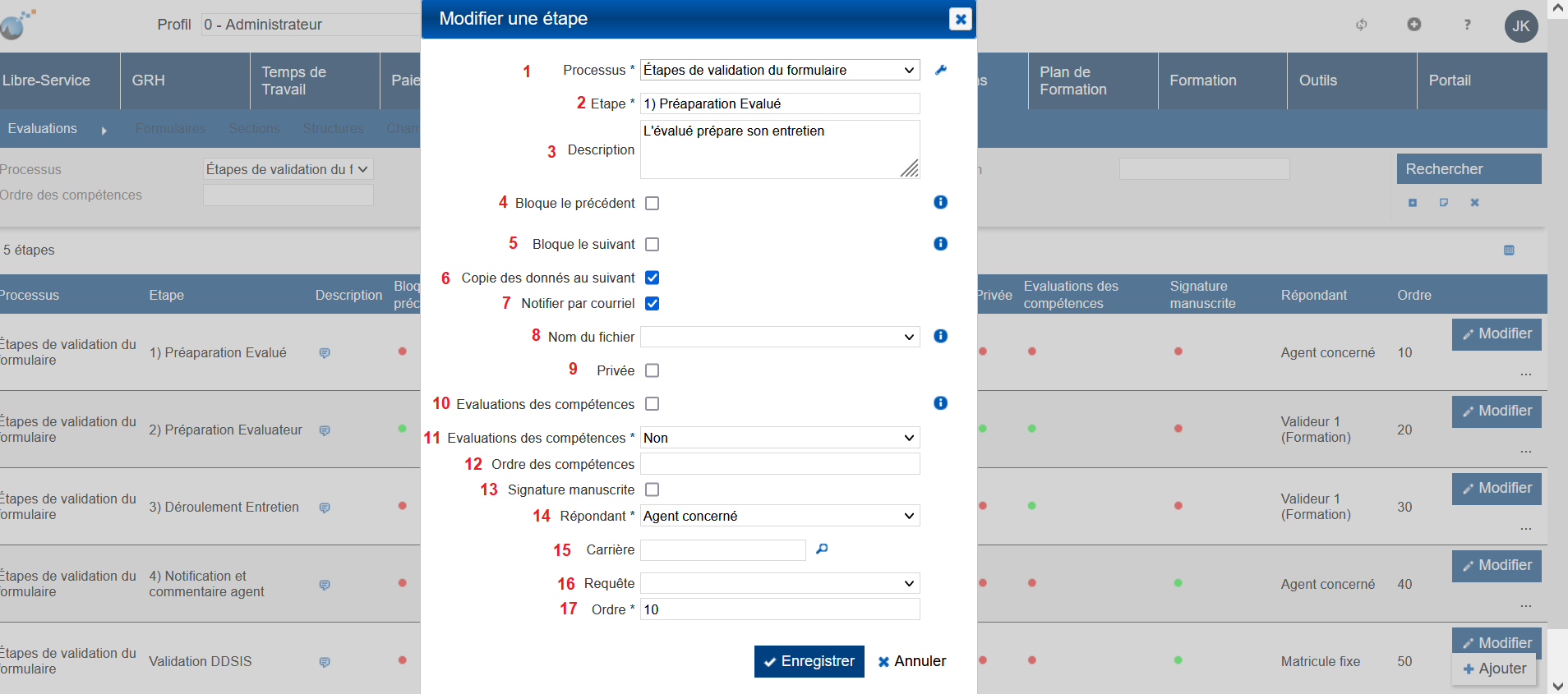 - Ordre des compétences : si les compétences sont évaluées dans cette étape, permet de définir à quel niveau elles doivent être évaluées par rapport à l’ordre des sections (Si il y a 4 sections avec les ordres 10, 20, 30 et 40, et que l’on souhaite que les compétences soient évaluées après la deuxièmes section, il faut saisir un numéro d’ordre entre 21 et 29) (12)