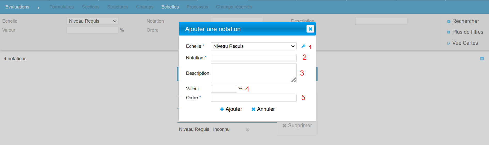 Les échelles et les champs doivent être paramétrés avant de pouvoir commencer les formulaires. Les échelles doivent être paramétrées avant les champs (un champ pouvant contenir une échelle).