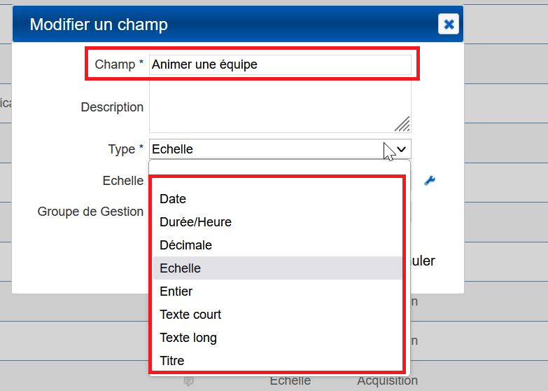 Les champs sont le contenu des structures. Un champ peut être un texte libre, des dates, heures, décimales, ou bien un choix, paramétré au préalable via les échelles.