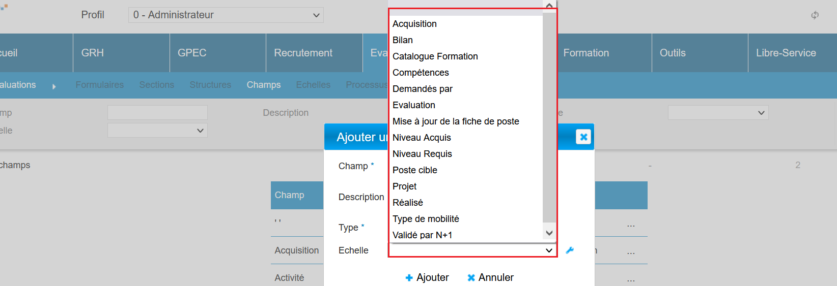 Ici les échelles sont les données qui pourront être sélectionnées dans les champs. Les échelles peuvent être utilisées pour créer les éléments de listes qui seront proposés en choix dans les formulaires.