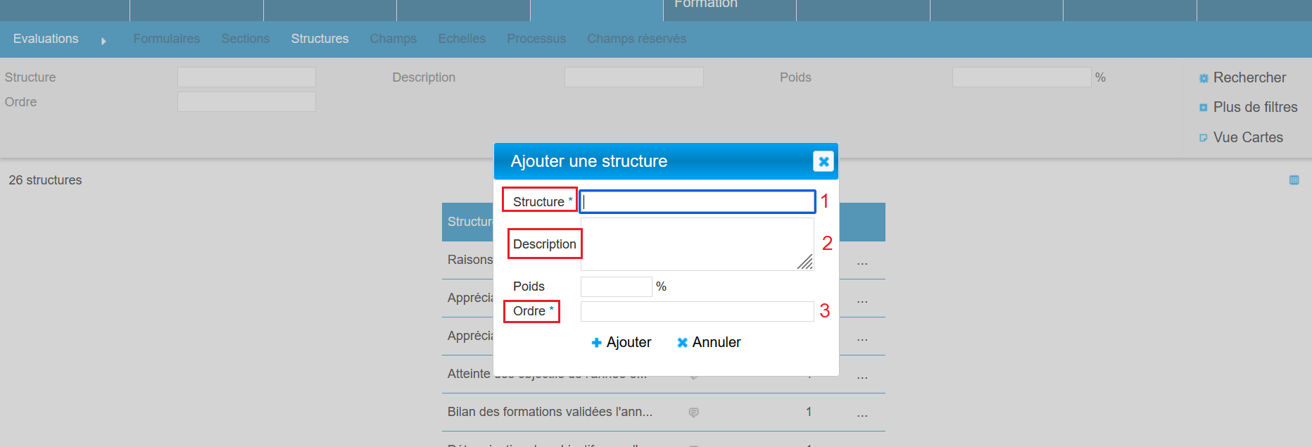 - Structure : Sélectionner la structure (par défaut la valeur sera celle de la structure en cours de création/modification) (1)