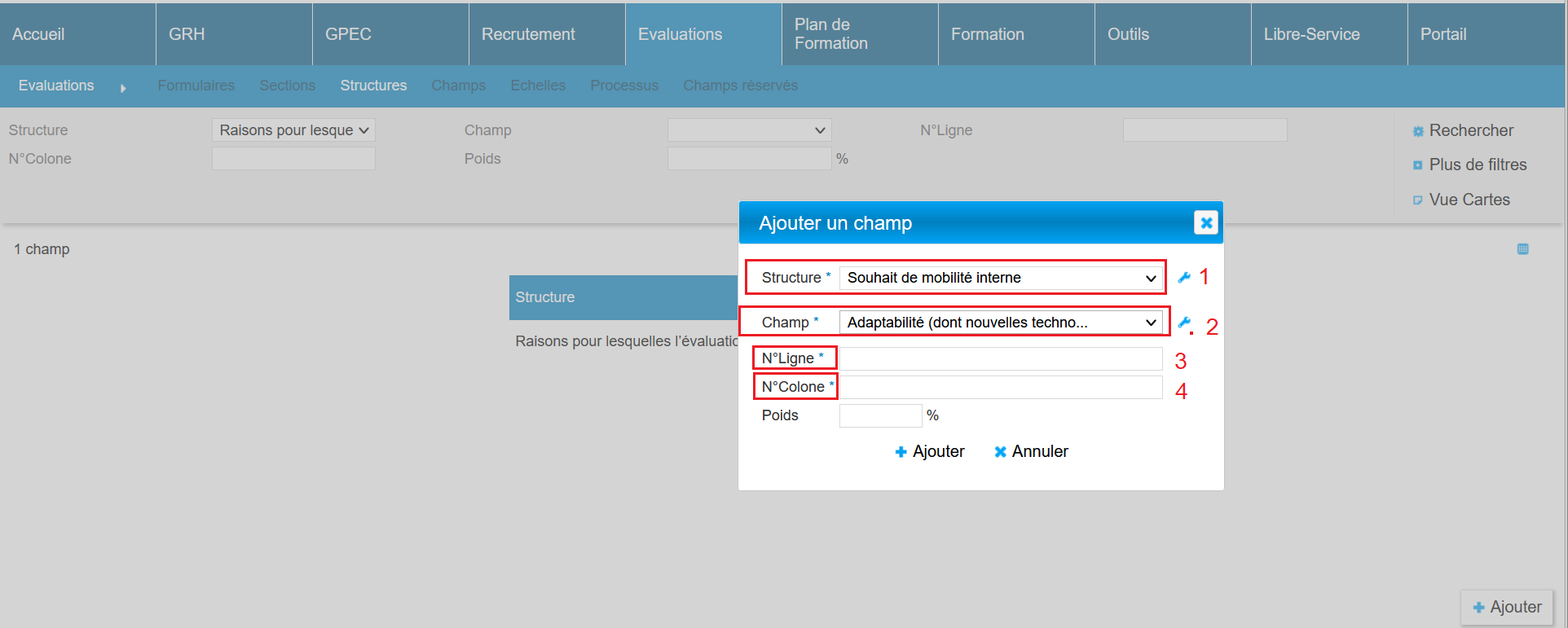 - Cliquer sur “+ Ajouter” pour ajouter un champ à la structure
