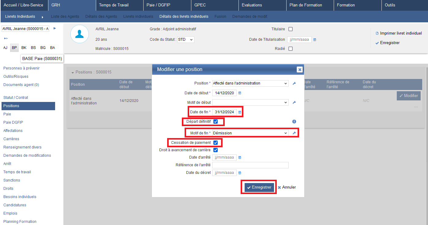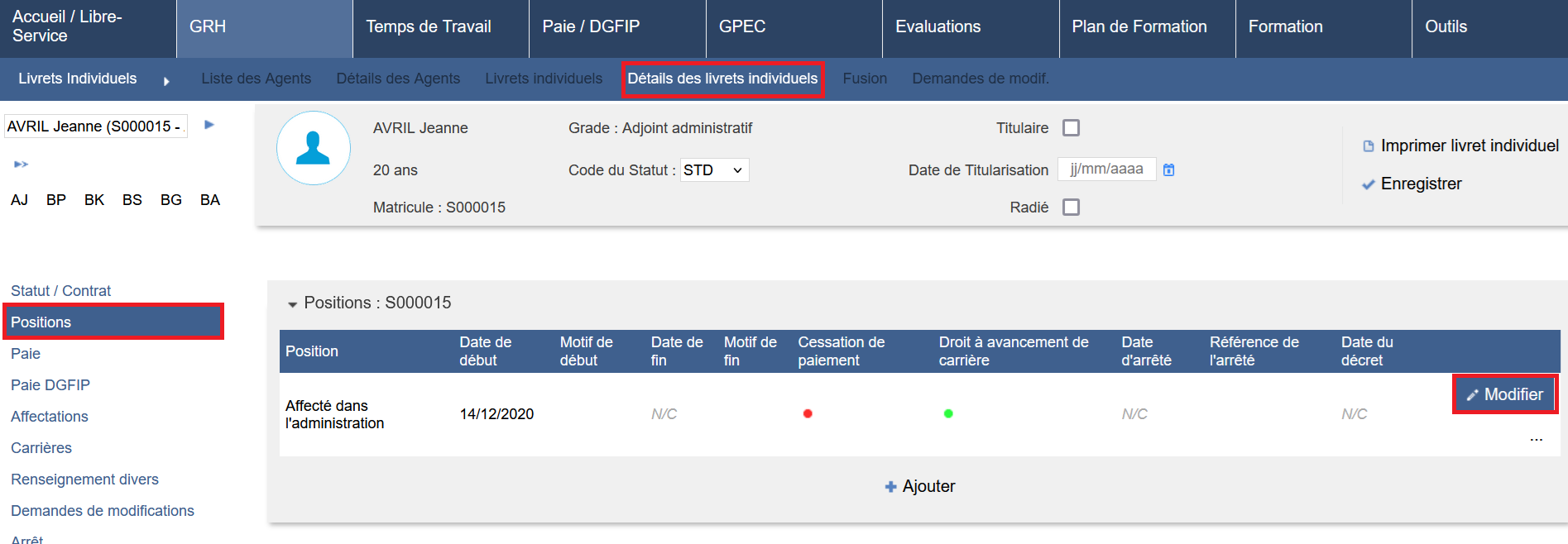 1- Dans GRH > livrets individuels > Détails des livrets, sélectionner le dossier de l’agent et se positionner sur l’onglet “Positions”.