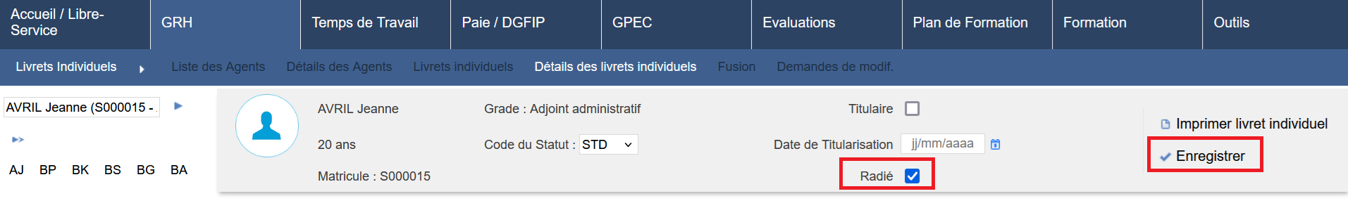 Une fois le départ de l’agent effectif, aller dans GRH > livrets individuels > Détails des livrets et sélectionner le dossier de l’agent.