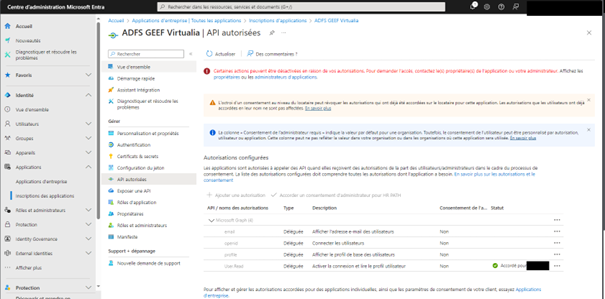 L’accès à l’adresse « email » est nécessaire pour obtenir l’identification de l’utilisateur. L’accès « openid » est nécessaire pour l’utilisation du protocole. L’accès à « profile » semble nécessaire pour la lecture du matricule RH de l’agent si présent dans l’annuaire. Ces éléments semblent être implicites par rapport au « User.Read ».