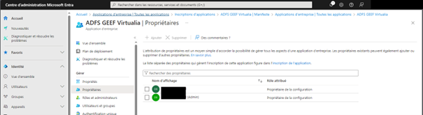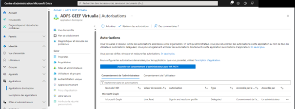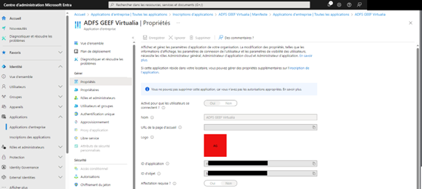 Ces captures proviennent du site Entra de Microsoft : https://entra.microsoft.com/ L’application GEEF/Virtualia V5 doit être déclarée dans cet écran avec un certain nombre de paramètres repris sur ces captures. La plupart de ces paramètres dépendent des règles internes de l’organisation. Ce paramétrage doit être réalisé par un administrateur du domaine.