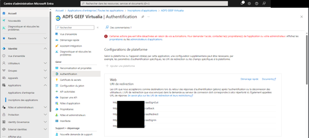 Les différentes URI de redirection ci-dessus doivent être autorisées. Le préfixe est celui du serveur, par exemple « https://geef.sdisXX.fr » serait à décliner en :