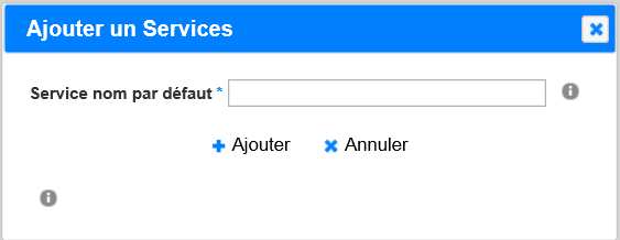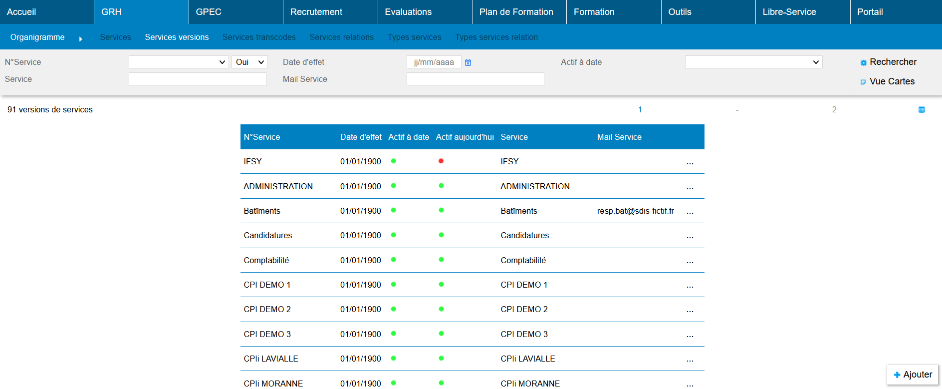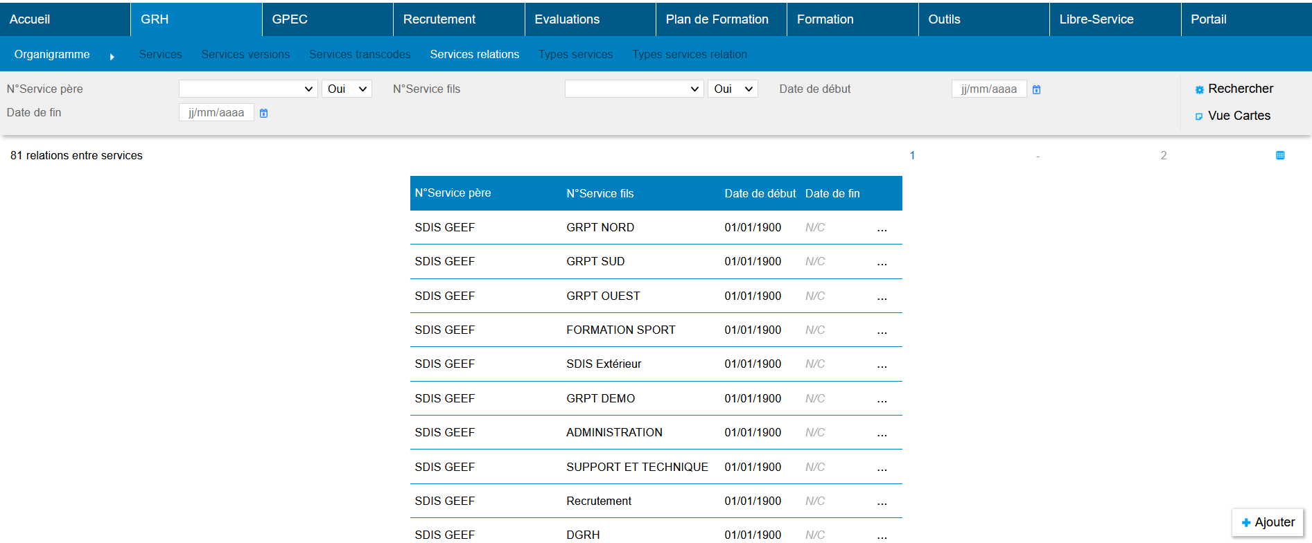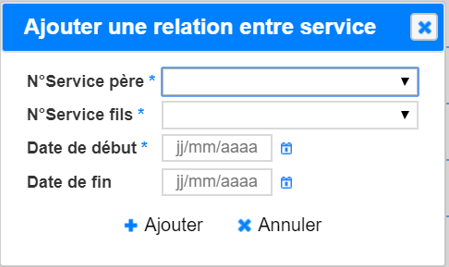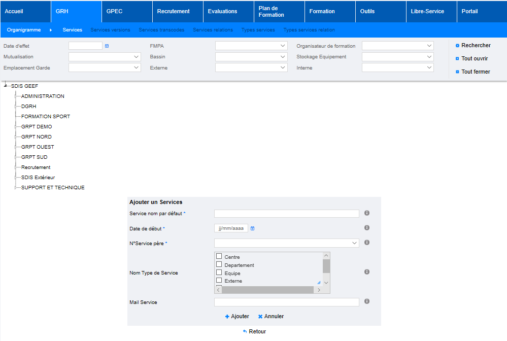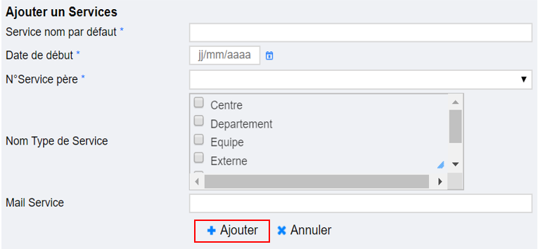 Cliquez sur « Ajouter », afin d’ajouter un nouveau service à votre organigramme, et d’y associer les informations utiles (nom par défaut du service, date de début, n° service père, type de service, mail du service).