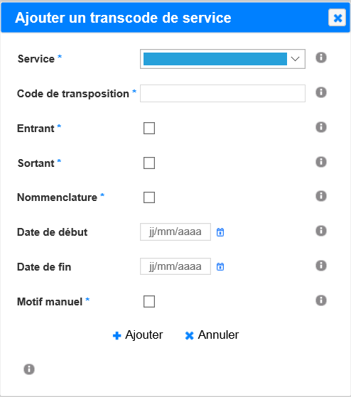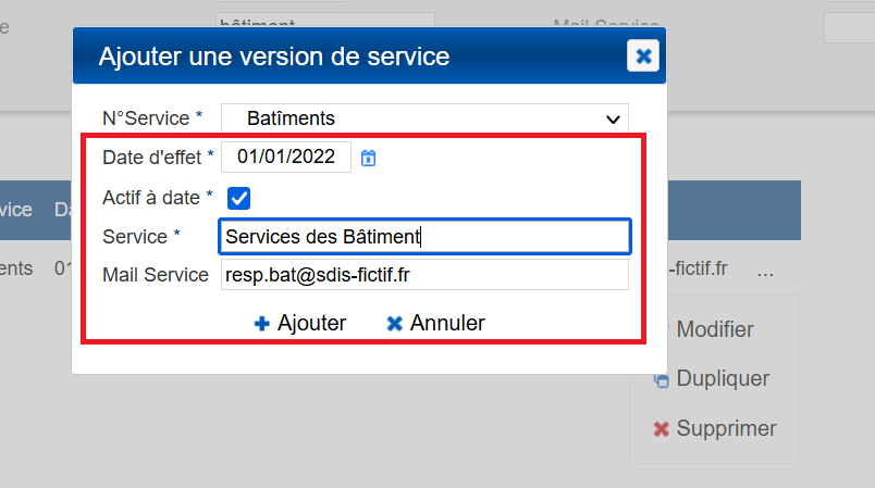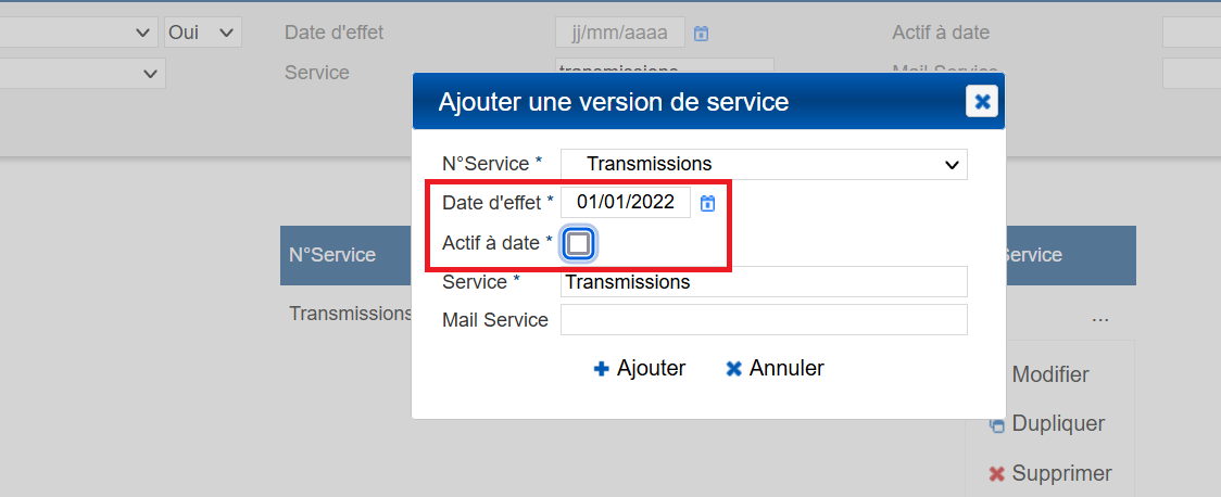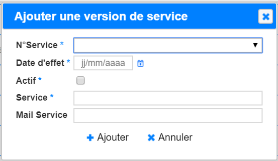 Cliquez sur « Ajouter » afin de créer une version du service, qui sera définie par sa date d’effet et son activité.