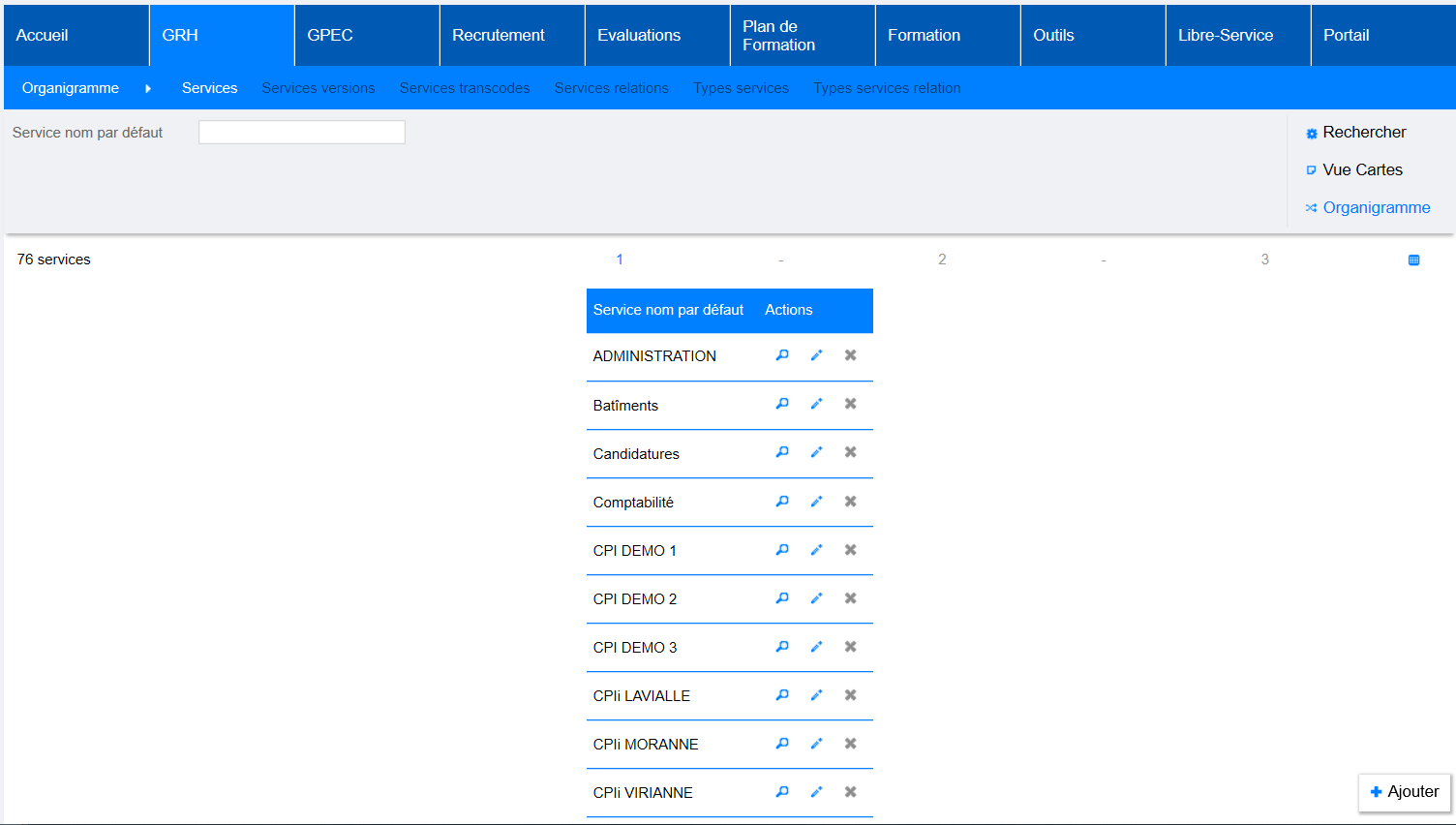 Pour mettre à jour un service, dans le cadre par exemple d’un chagement de libellé, aller dans GRH/Administration > Organigramme > Service version.
