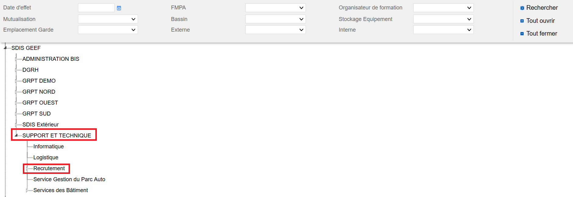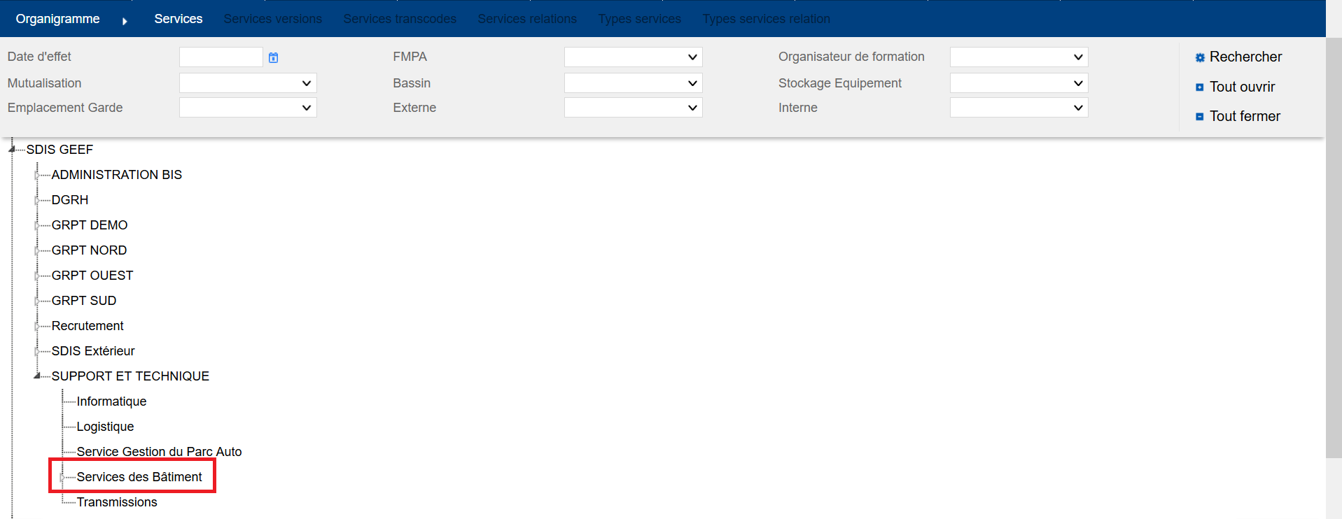 Cet écran permet de gérer et consulter les informations interfacées des services. Si l’organigramme est créé dans GEEF par interface, les données de cet écran s’alimenteront automatiquement.