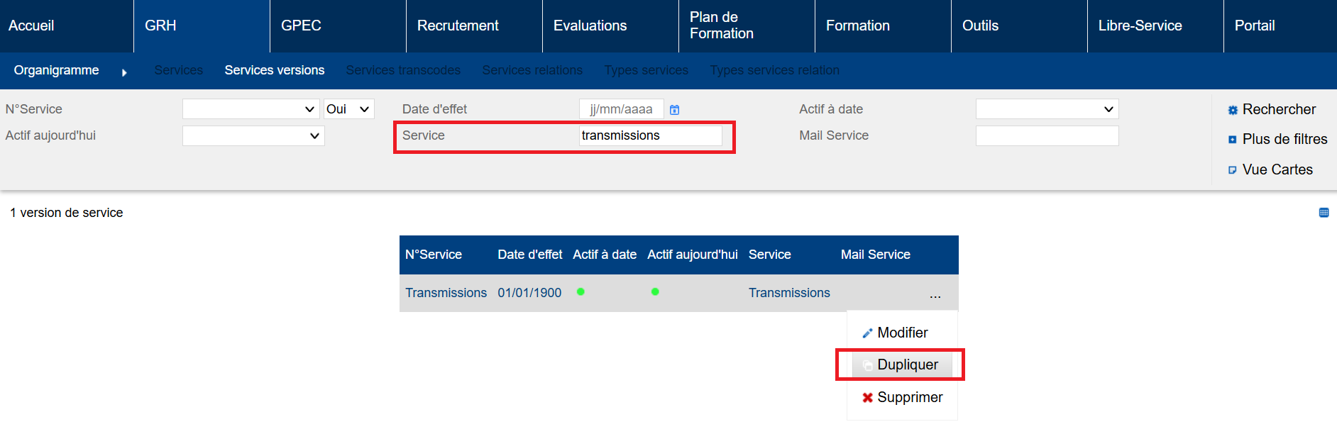 Dans le cas de fermeture d’un service, il ne faut pas le supprimer mais l’inactiver. Pour cela, il faut créer une nouvelle version de service inactive à la date d’effet dans GRH/Administration > Organigramme > Service version.
