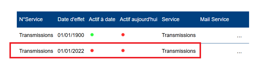 Le bouton “Actif aujourd’hui” se met à jour en fonction des versions de service. Si le service a une version active à la date du jour alors le voyant sera au vert.