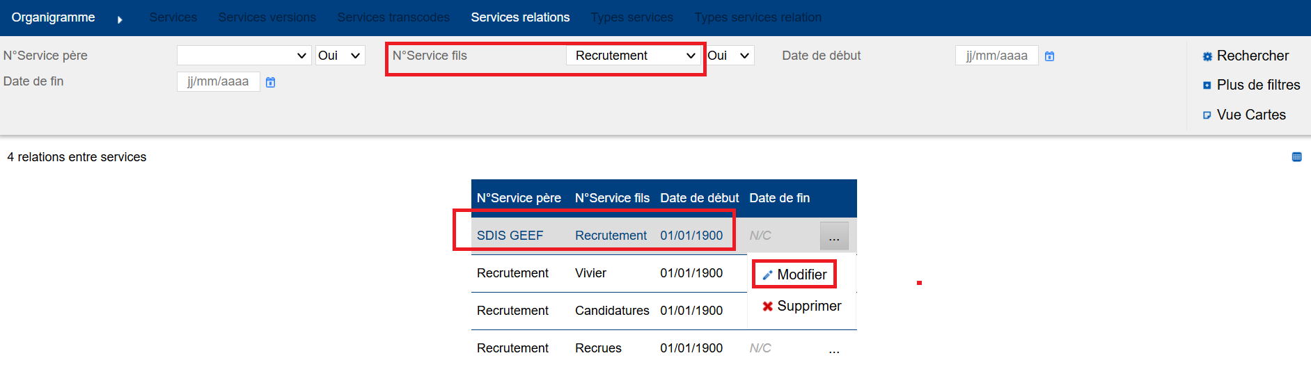 - Sélectionner le nouveau service père, et dans service fils renseigner le service à modifier