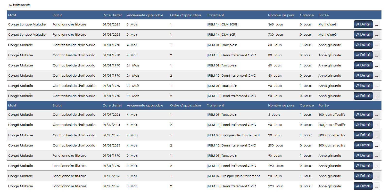 Si aucune règle de traitement n’est paramétrée pour une absence et un statut, aucune donnée ne ressortira dans le détail de l’absence maladie.