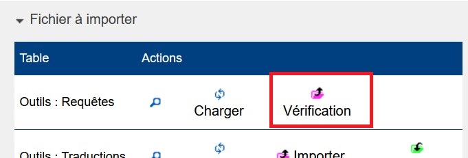 7- L’application tente une mise à niveau automatique de la structure de la base de données. Quelques minutes après le redémarrage de Tomcat, consulter l’écran “Outils > Optimisation BD”, le bouton “Vérification” pour la table “Outils : Requêtes” qui ouvre une nouvelle fenêtre indiquant le différentiel de structure des tables de la base de données.