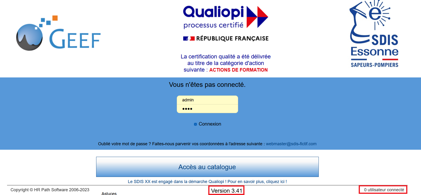 A noter : Sont visibles en bas de la page de login le numéro de version ainsi que le nombre d’utilisateurs connectés :