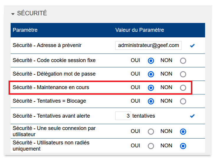 Avec le paramètre à « OUI », seuls les utilisateurs avec un rôle leur donnant accès à la modification du paramètre pourront se connecter à GEEF. Les autres utilisateurs ne pourront pas se connecter à l’application et auront un refus d’accès “Maintenance en cours”.