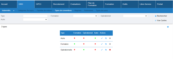 Le type de convention : ces typologies sont paramétrables dans l’écran « GRH > Indemnités > Types de conventions » (nécessite le module « Convention-Employeurs ») ;