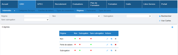 Les régimes de convention, paramétrables dans l’écran « GRH > Indemnités > Régimes » (nécessite le module « Convention-Employeurs ») ;