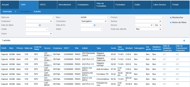 L’écran « Activités » reprend les participations à des sessions de stage, des évènements et des FMPA sur centres des agents pour lesquels les employeurs ont été renseignés. On retrouve notamment dans cet écran les participations des agents au titre des subrogations.