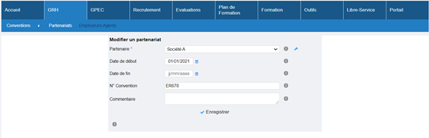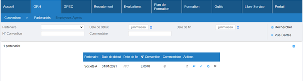 L’écran « GRH > Conventions > Partenariats », donne la possibilité de créer, modifier et supprimer les partenariats. Il s’agit par exemple de partenariats d’accueil d’enfants pour les agents en opération.