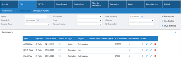 Cet écran permet de visualiser par agent, les informations saisies concernant leurs employeurs. On y retrouve notamment les conventions.