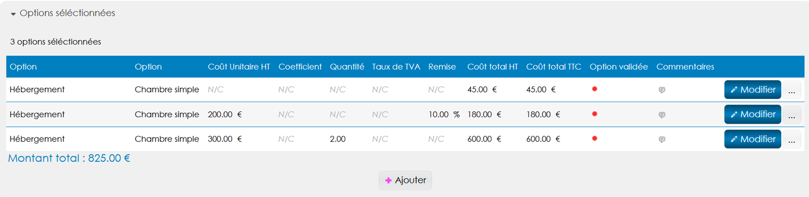 - Les options : qui constituent le corps du devis : à paramétrer dans l’écran Formation/Administration -> Commercialisation -> Types d’options (classification des options) et Formation/Administration -> Commercialisation -> Options