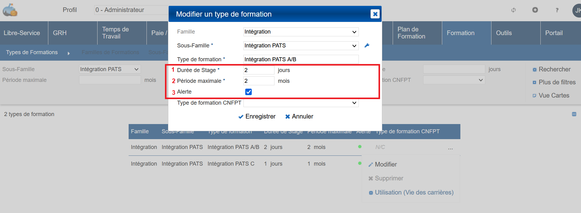 Durée de stage : Durée que le stagiaire doit passer sur un stage lié au type de formation (1). Par exemple, si le type de formation “Intégration PATS A/B a une durée paramétrée à 2 jours, mais que le seul stage lié à ce type de formation ne dure qu’un jour, le stagiaire devra participer à deux sessions de ce stage.