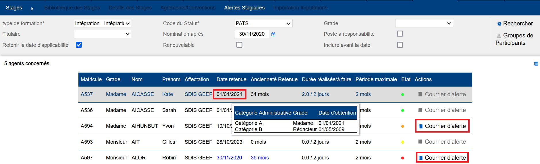 La liste reprend l’identification de l’agent, son statut, son affectation et la date retenue. En survolant la date retenue pour un agent, l’historique des grades de cet agent apparaitra en infobulle. Par type de formation, il est alors cumulé le nombre de jours effectués en comparaison au nombre de jours à faire dans la période impartie. Un feu alerte alors du statut du stagiaire. Lorsque ce feu est orange ou rouge, une lettre peut être générée grâce au bouton “Courrier d’alerte”.