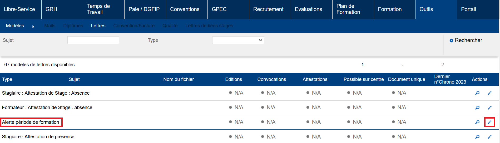 Le modèle de courrier peut être défini via “Outils / Administration > Modèles > Lettres” (type : “Alerte période de formation”).