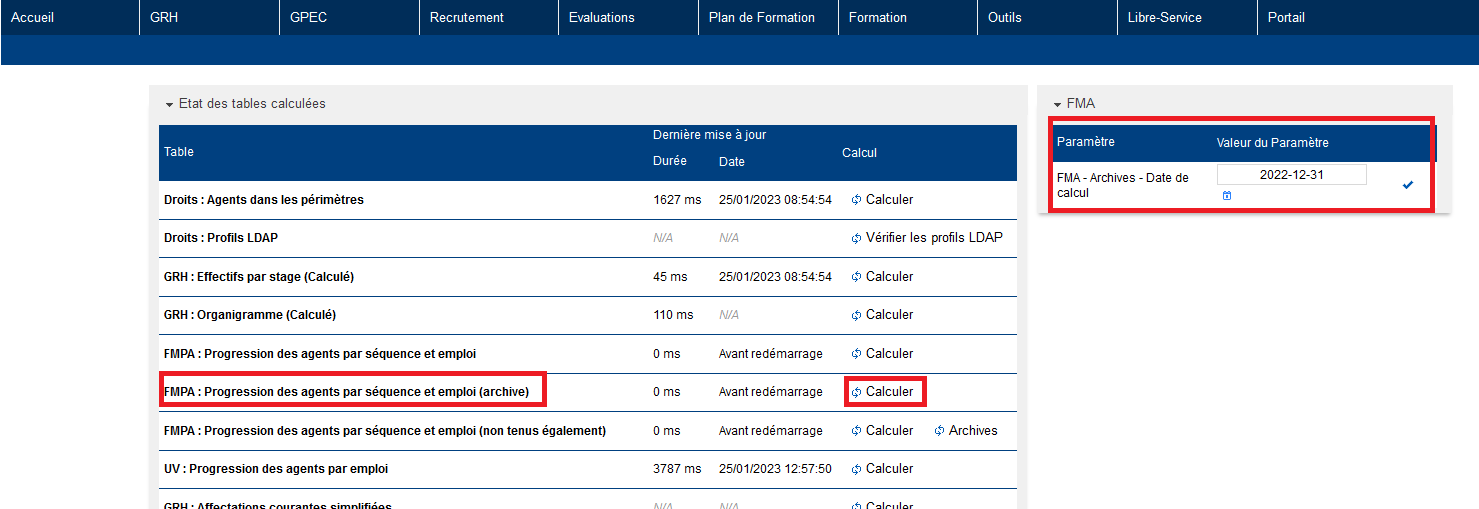 La table “FMPA : Progression des agents par séquence et emploi (archive)” est calculée en fonction du paramètre FMA - Archives - Date de calcul.