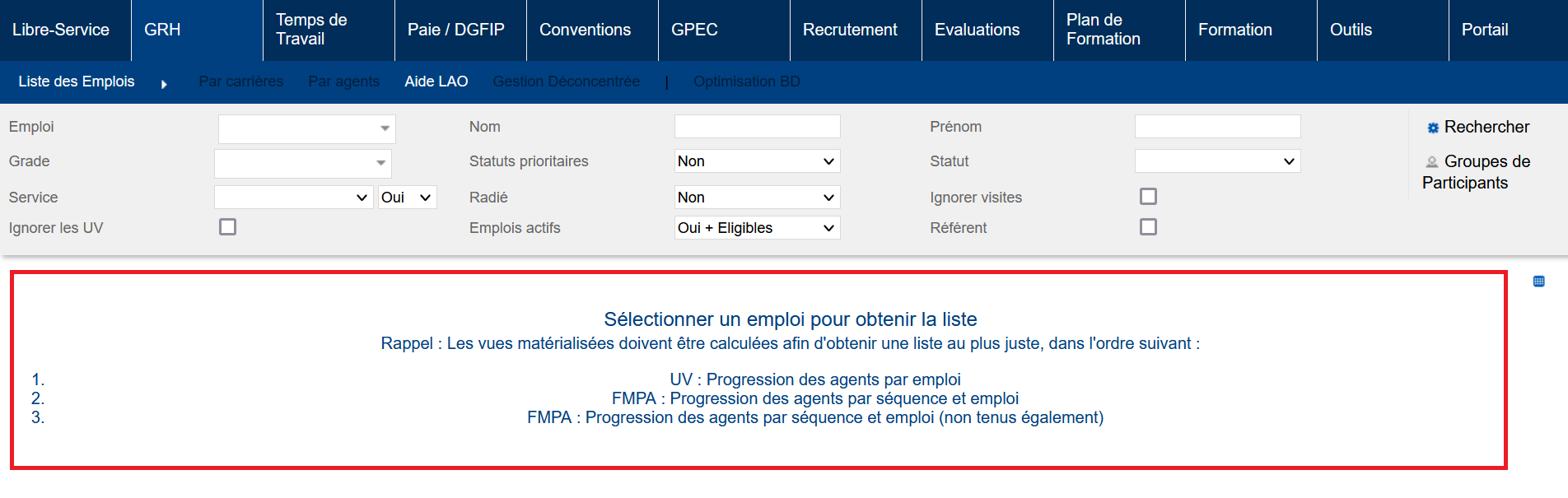 Les écrans “Aide LAO” et “Gestion déconcentrée” (GRH > Liste des Emplois > Aide LAO / Gestion déconcentrée) se basent sur la table calculée “FMPA : Progression des agents par séquence et emploi (non tenus également)” qui nécessite que des tables intermédiaires soient mises à jour :