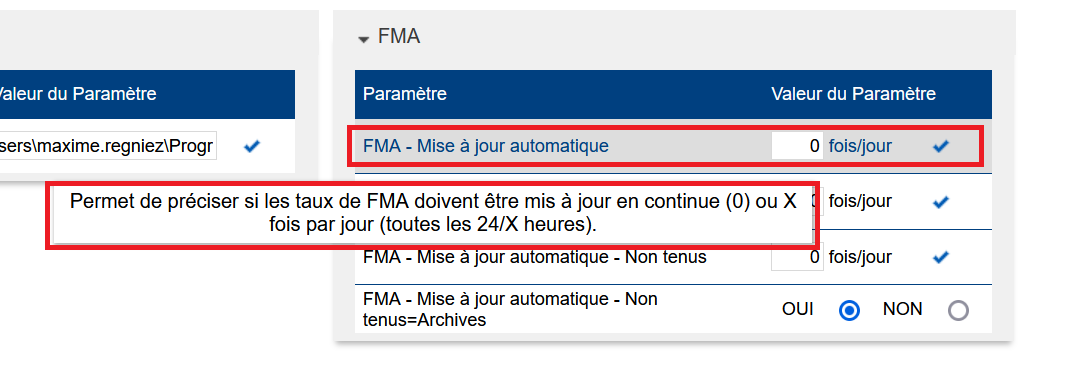 Paramètre “FMA > FMA - Mise à jour automatique” : calculée X fois par jour ou en temps réel (saisir 0 pour du temps réel)