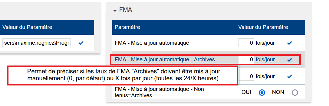 Paramètre “FMA > FMA - Mise à jour automatique - Archives” : cette fois, le “0” indique “jamais calculé automatiquement, seulement manuellement”