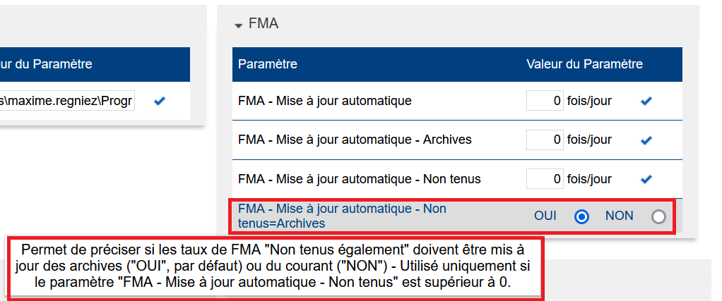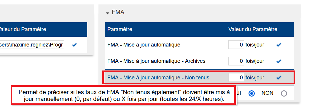 Paramètre “FMA > FMA - Mise à jour automatique - Non tenus” : Le “0” indique “jamais calculé automatiquement, seulement manuellement”