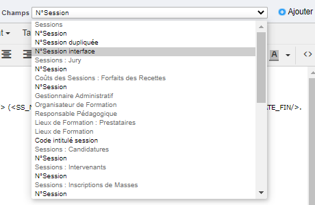 Champs : permet de sélectionner des balises de publipostages à insérer dans le modèle. La liste des balises étant relativement longue, il est possible de faire un clic droit sur le volet déroulant pour effectuer une recherche de la balise souhaitée.