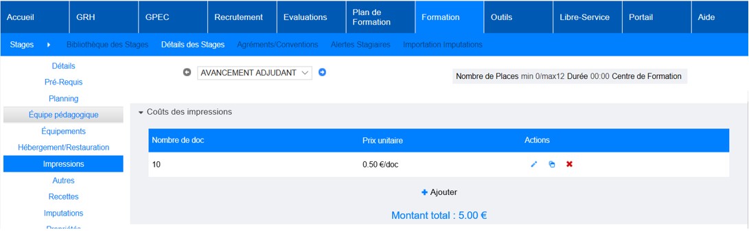 Pour chaque modèle de stage, il est possible de renseigner des coûts prévisionnels. L’objectif étant d’y intégrer par anticipation les dépenses récurrentes des sessions.